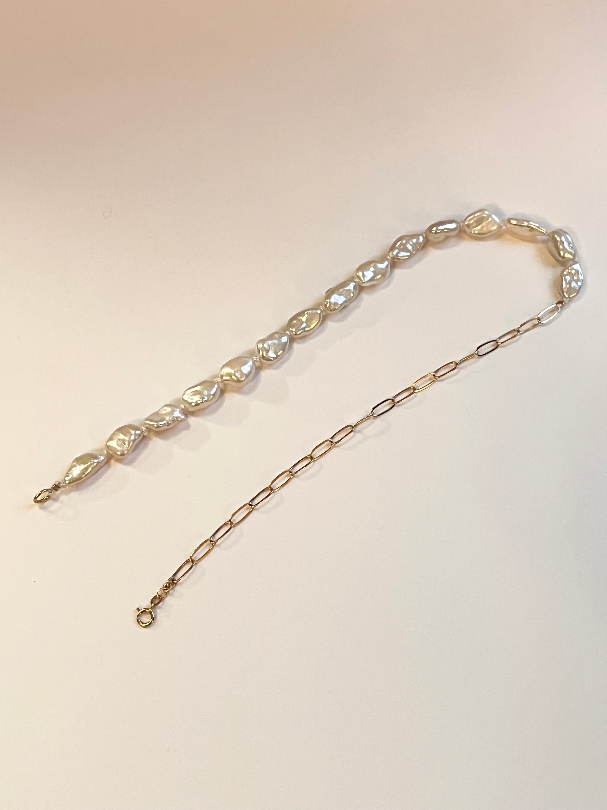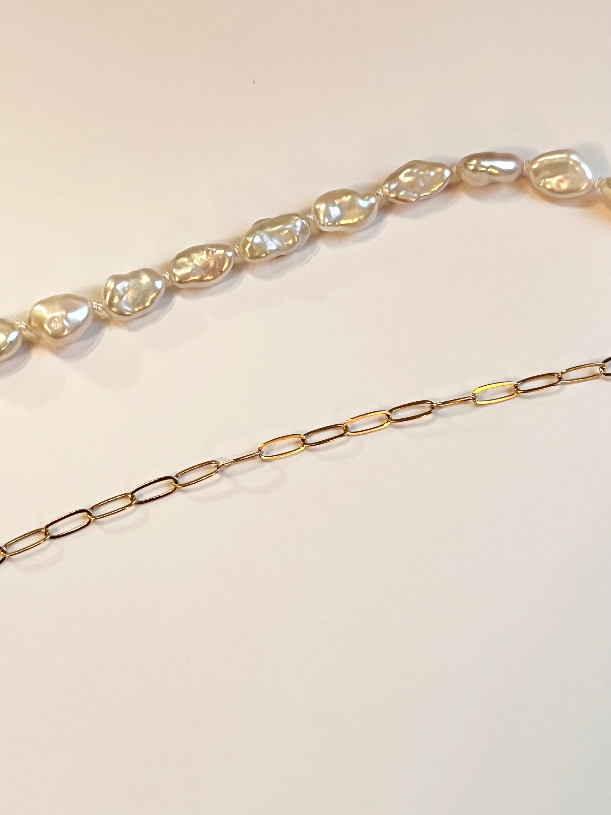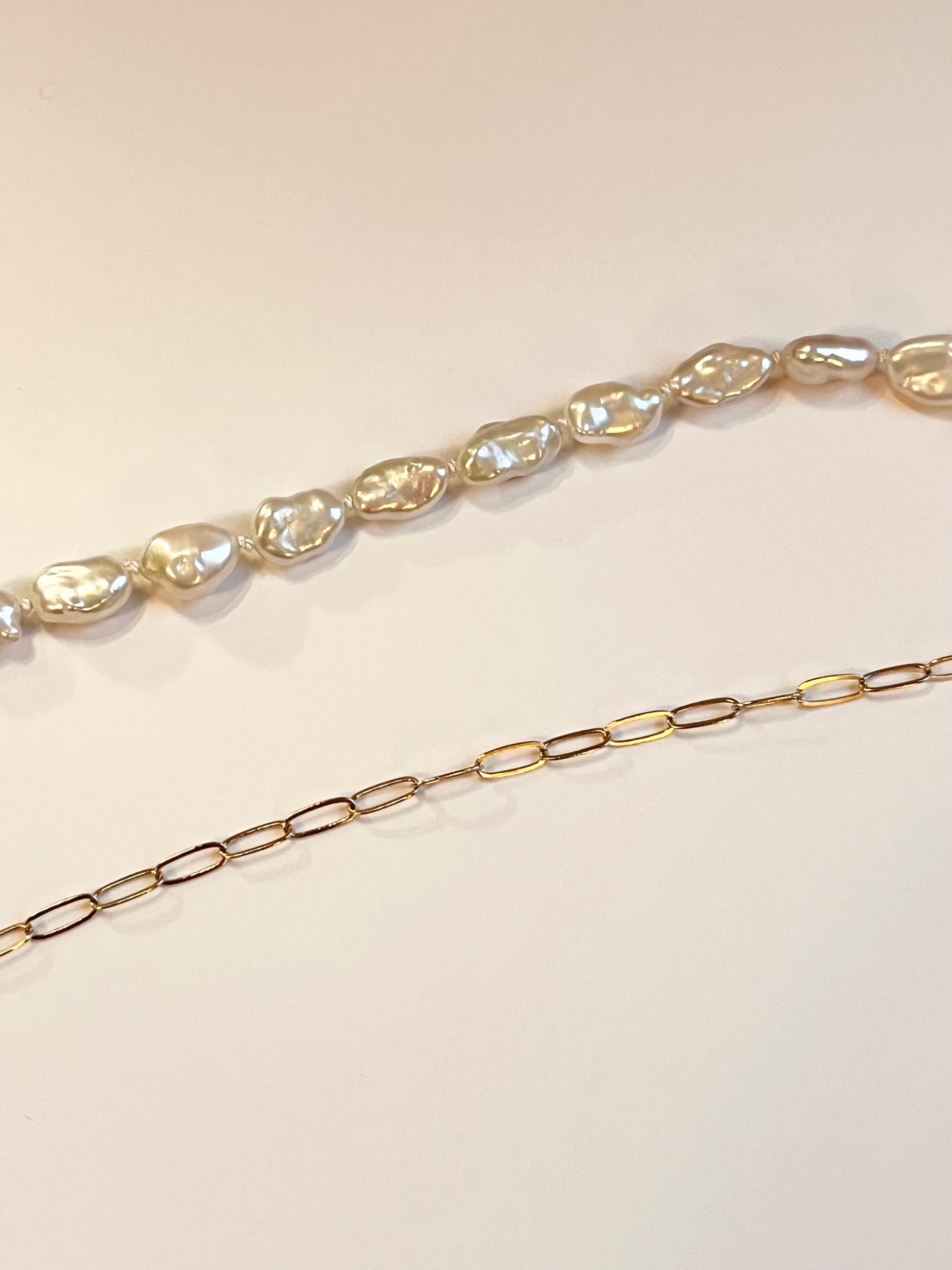 Handcrafted 14k yellow gold meets moody baroque pearls in this bracelet that refuses to pick a side. Delicate 3mm paperclip chain links with 8mm freshwater pearls for an unexpectedly cool contrast—think boardroom polish meets downtown edge. Because who says you can't be both elegant and edgy? Layer it, stack it, or let it shine solo. The perfect accessory for anyone with a little bit of everything in them.