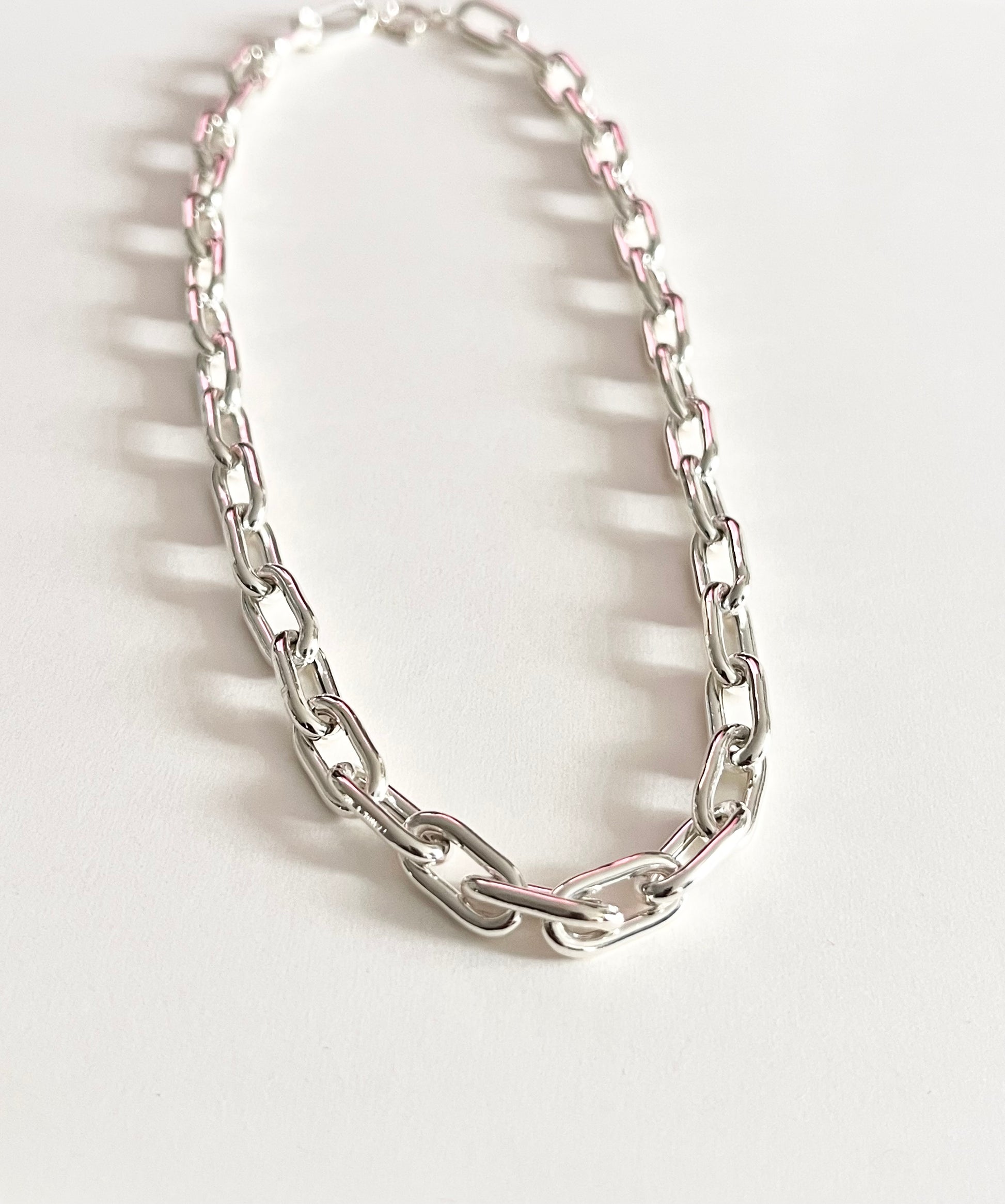 Add a touch of charm to your look with this handcrafted sterling silver chunky elongated curb chain necklace. Perfect on its own or as a playful base for your favorite charms, it’s designed to bring bold style and endless personality to any outfit.